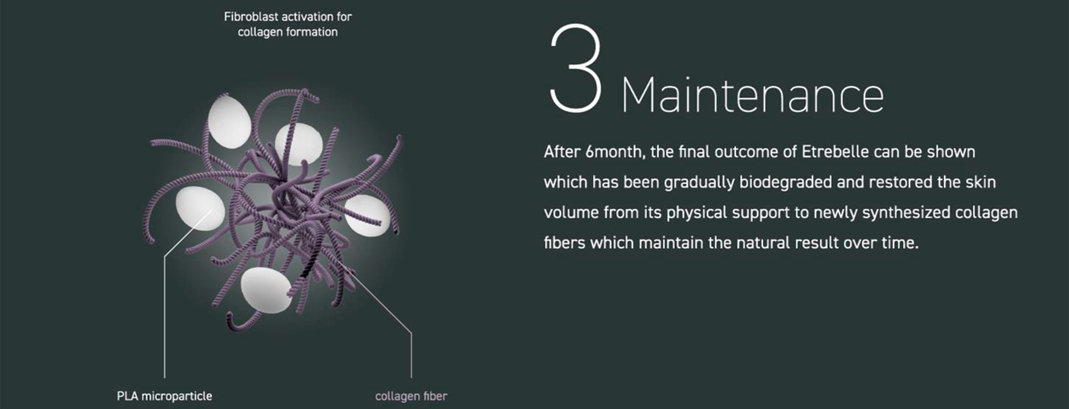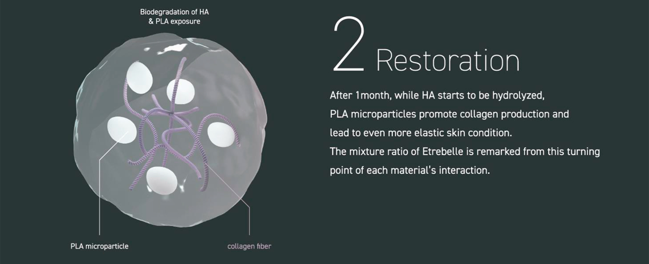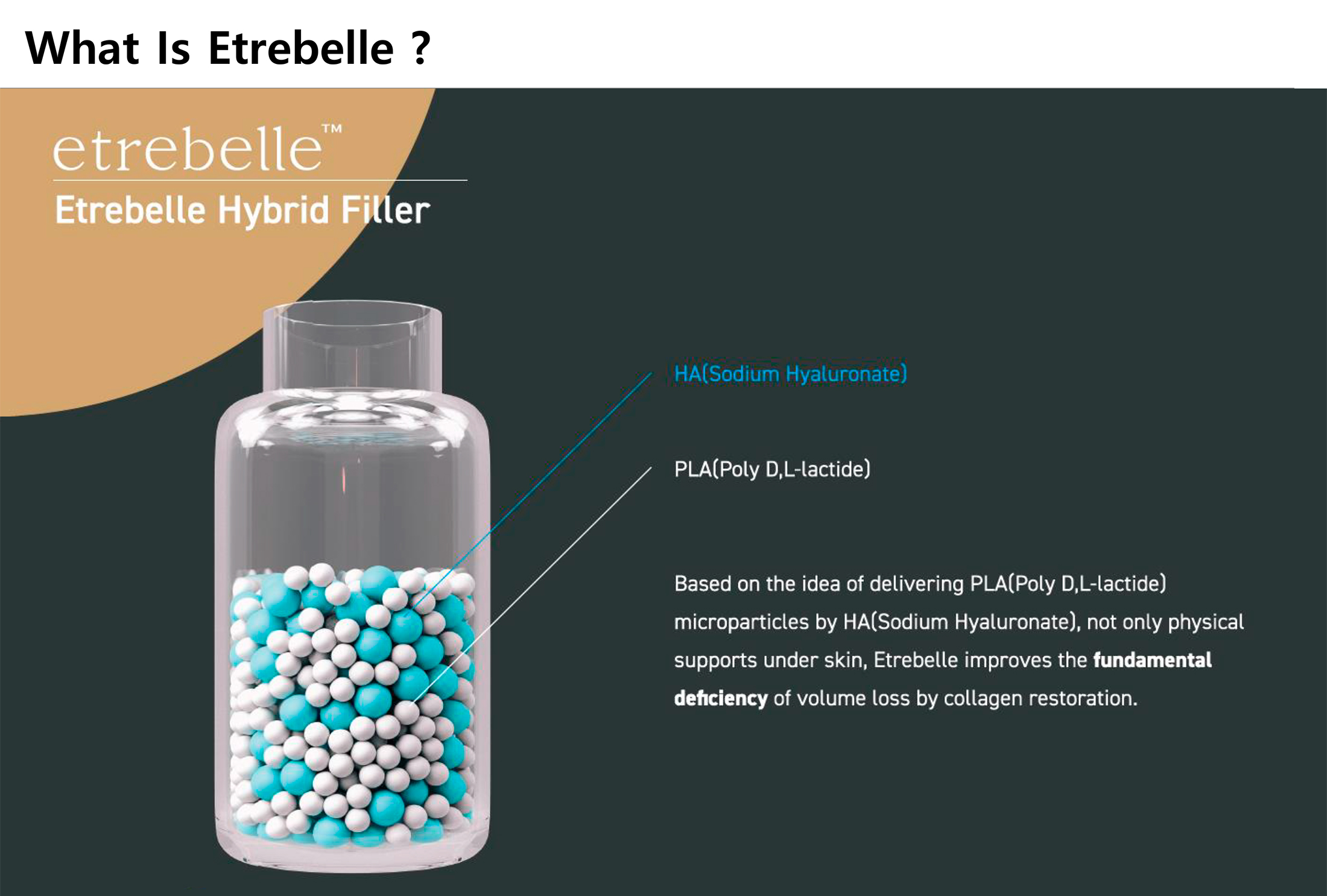 Etrebelle is a hybrid filler that combines the benefits of the instant filling effect of hyaluronic acid and the stimulation of PLA collagen production under the skin. Based on the idea of delivering PLA (poly-D, L-lactide) microparticles via HA (sodium hyaluronate) and not just physical skin support, Etrebelle addresses the fundamental volume loss deficit by rebuilding collagen.