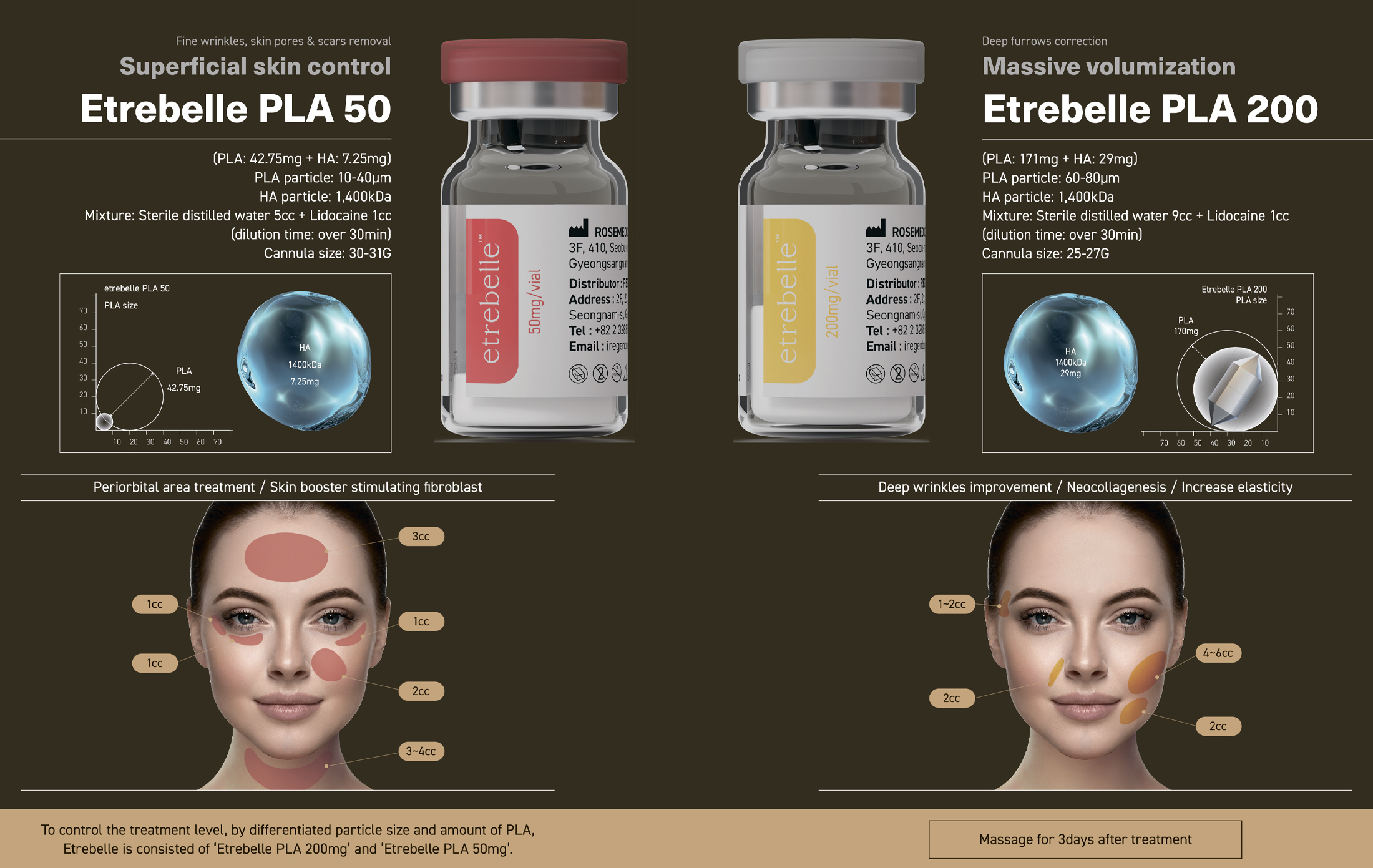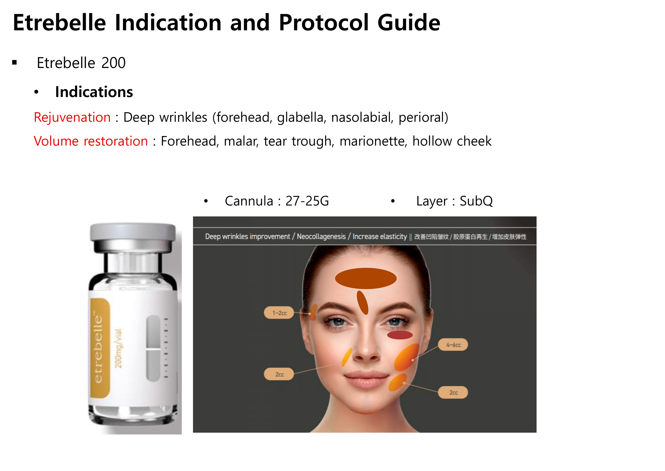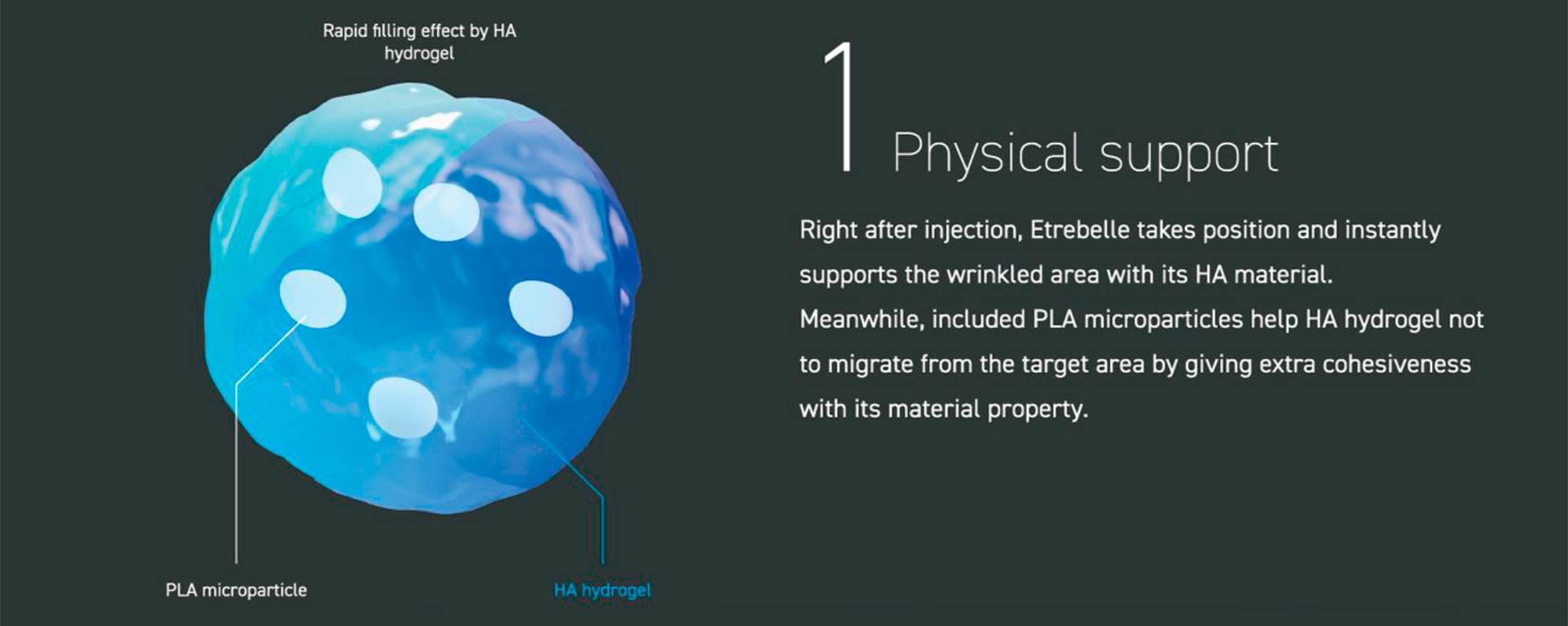 Etrebelle is a hybrid filler that combines the benefits of the instant filling effect of hyaluronic acid and the stimulation of PLA collagen production under the skin. Based on the idea of delivering PLA (poly-D, L-lactide) microparticles via HA (sodium hyaluronate) and not just physical skin support, Etrebelle addresses the fundamental volume loss deficit by rebuilding collagen.