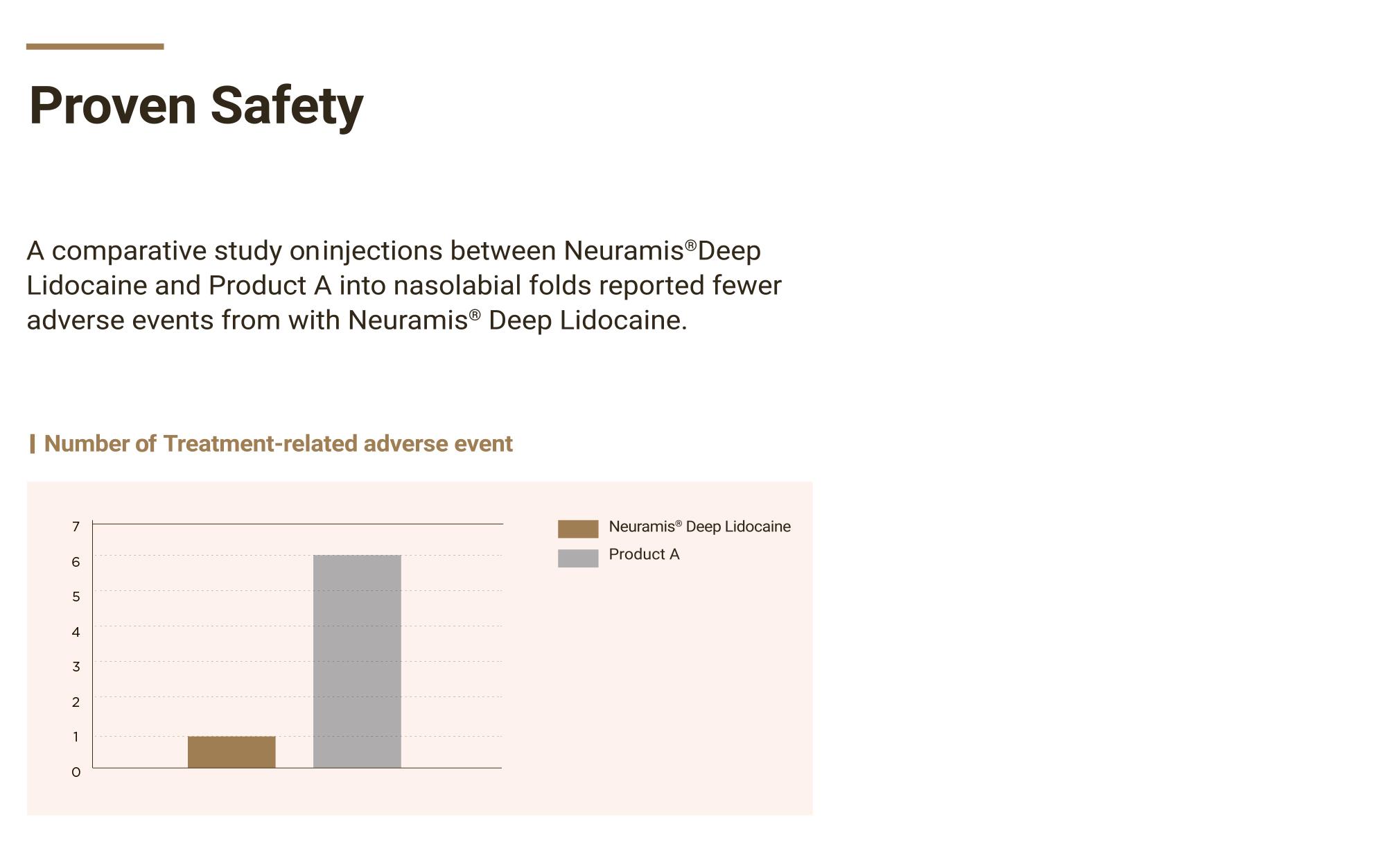 It has a high degree of biocompatibility and completely dissolves within human tissue. This biocompatibility also eliminates the risk of allergic reactions from using the product. Neuramis deep contains 0.3% lidocaine, which helps numb the skin, making injection as painless as possible.