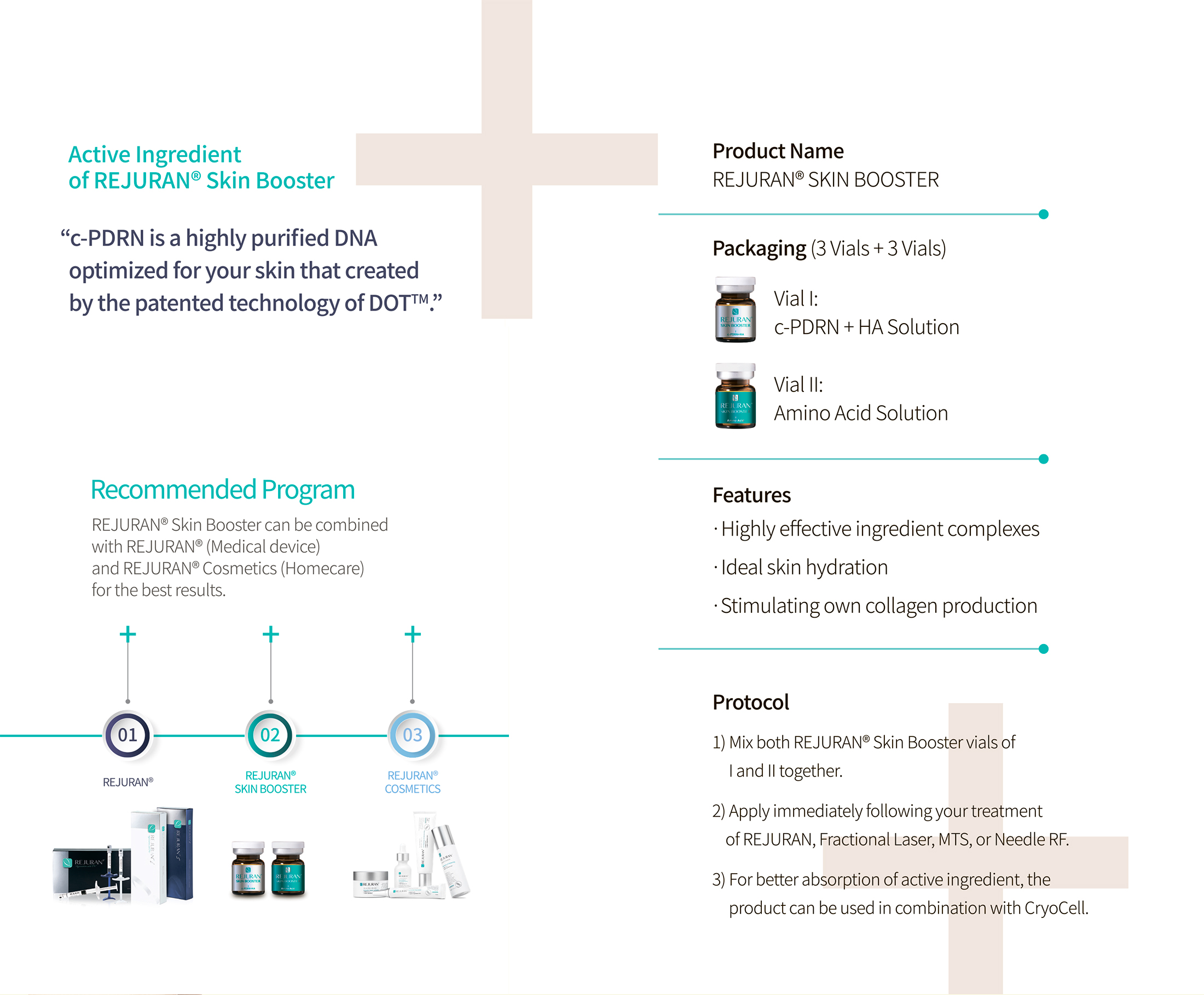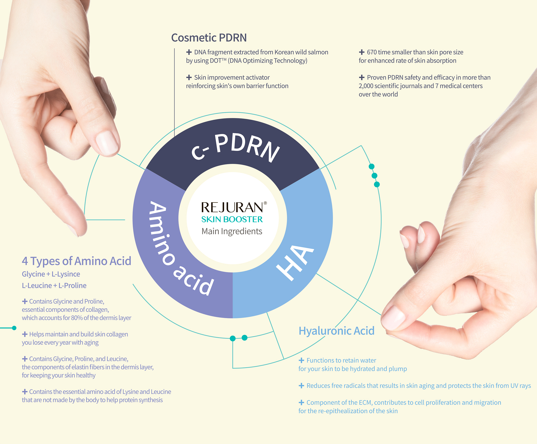 Rejuran skin booster is an injection solution that contains an innovative combination of hyaluronic acid (HA), C-PDRN, and numerous amino acids, which repair the skin and give it a clear look. The amino acids improve the texture of the skin with their glycine and proline content, which make up 80% of the top dermis layer and ensure adequate moisture and collagen release. Leucine also ensures the optimum health of the skin and protects it from germs and lack of moisture.